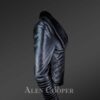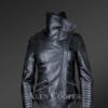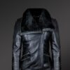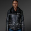Available in a variety of sizes, this Womens leather motorcycle jacket with wool looks modern and chic. Most important is its protection ability. To point out, it carries stalwart piped feature along prone parts like cuff joints. However, the detailing adds to the beauty. The collar features soft Sheepskin wool trim. The zippered front closing is aligned diagonally. Additionally, zip-line serves as an accessorizing as well as functional trait along cuffs.