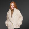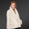 This womens mink bomber with hood is an alluring piece that instinctively mesmerizes one’s glance with its serenity and smooth texture. Its soft uniform appearance demonstrates the usage of natural mink fur in its finely detailed crafting process. Alen Cooper efficiently adds this newly launched warm wear to its exquisite product range for women. Skilled craftsmen use natural full-skin mink pelts in designing this furry wear. The premium quality of authentic fur furnishes pleasant warmth to the wearer with restfulness. The inside of this jacket provides a velvety satin lining for a soothing feel to the wearer’s body. The immaculate snowy white shade makes this beautiful jacket an outright head-turner at any social event or fest.