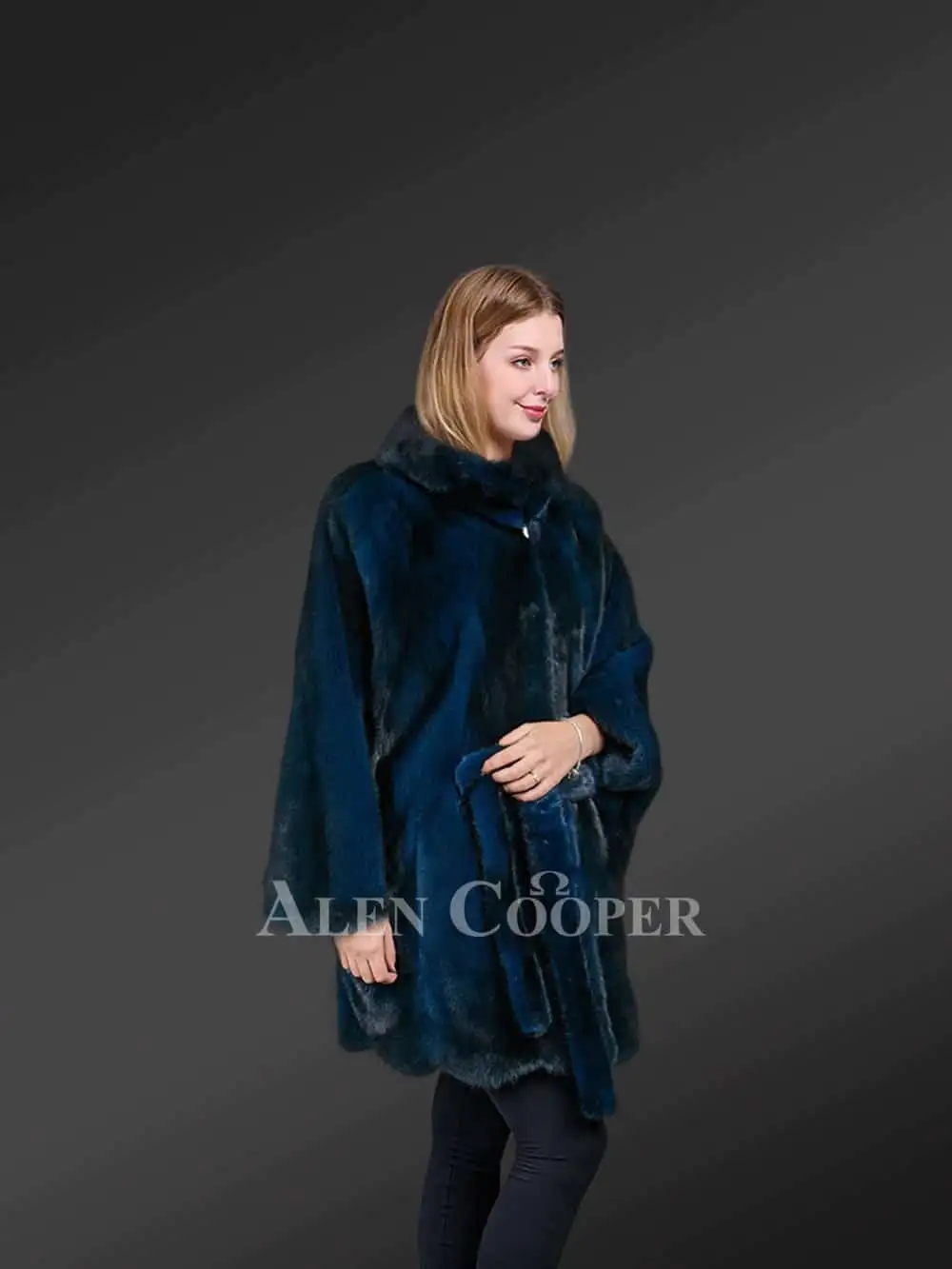 - Magnificent cape-style coat of mink fur looks brilliant in navy blue shade with long batwing sleeves