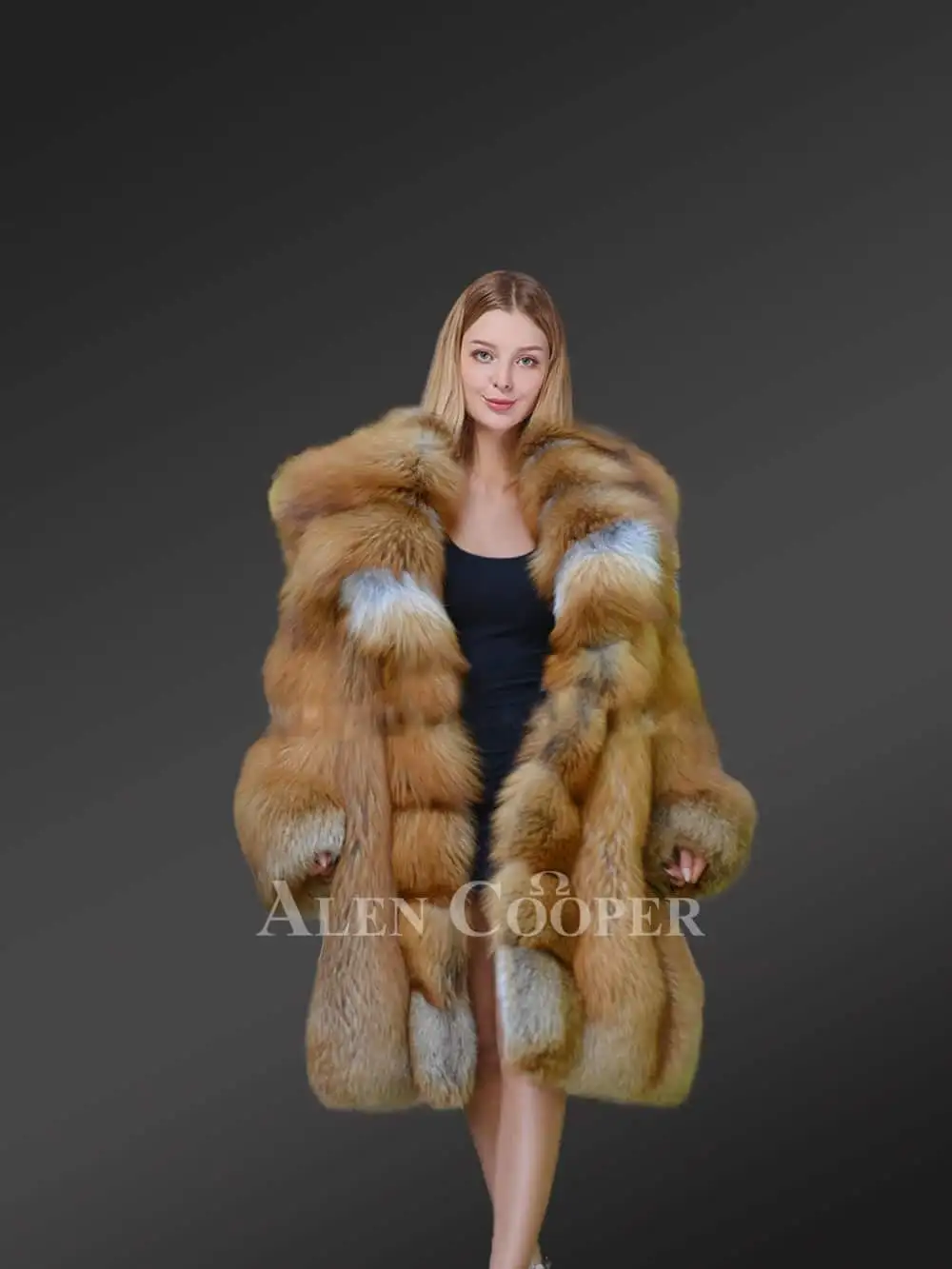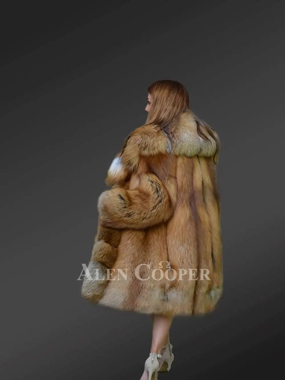 Alen Cooper ensures this luxurious fox fur outerwear provides women with a diva look warmly decked in gracefulness. Original pelts of red fox fur emanate thermal insulation, combating the frigid weather with sumptuous elegance. This womens original red fox fur coat impresses the viewer with due diligence to its exquisite features and classy polychromatic shades. The distinctive pattern tailored through scrupulous craftsmanship makes it an optimal choice for wintertime galas or social get-togethers. This coat can be coupled with trendy denim or even a beautiful short dress. Despite its voluminous body, it ensures easy mobility with a free-flowing form without any overburdening feel.