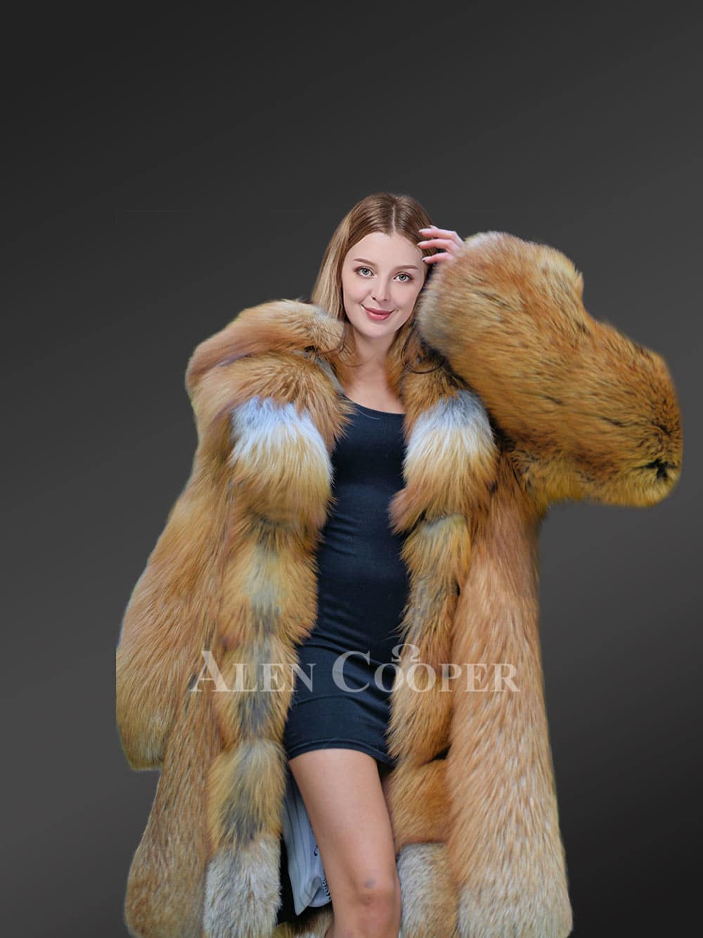 Alen Cooper ensures this luxurious fox fur outerwear provides women with a diva look warmly decked in gracefulness. Original pelts of red fox fur emanate thermal insulation, combating the frigid weather with sumptuous elegance. This womens original red fox fur coat impresses the viewer with due diligence to its exquisite features and classy polychromatic shades. The distinctive pattern tailored through scrupulous craftsmanship makes it an optimal choice for wintertime galas or social get-togethers. This coat can be coupled with trendy denim or even a beautiful short dress. Despite its voluminous body, it ensures easy mobility with a free-flowing form without any overburdening feel.