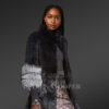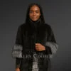 This luxurious mid-length womens rabbit fur black coat exudesrefined elegance and bringscozy warmthof plush natural fur to the wearer. It features three-quarter sleeves. Designers have used three tiers of Silver fox fur to accentuate each cuff thus creating a striking contrast that enhances the texture as well as the visual appeal of this outfit. The high-neck collar offers more insulation and gives the silhouette a polishedlook. Furthermore, the silk satin lining ensures exceptional comfort with every wear and the durable hook-and-eye fasteners provide a secured fit.