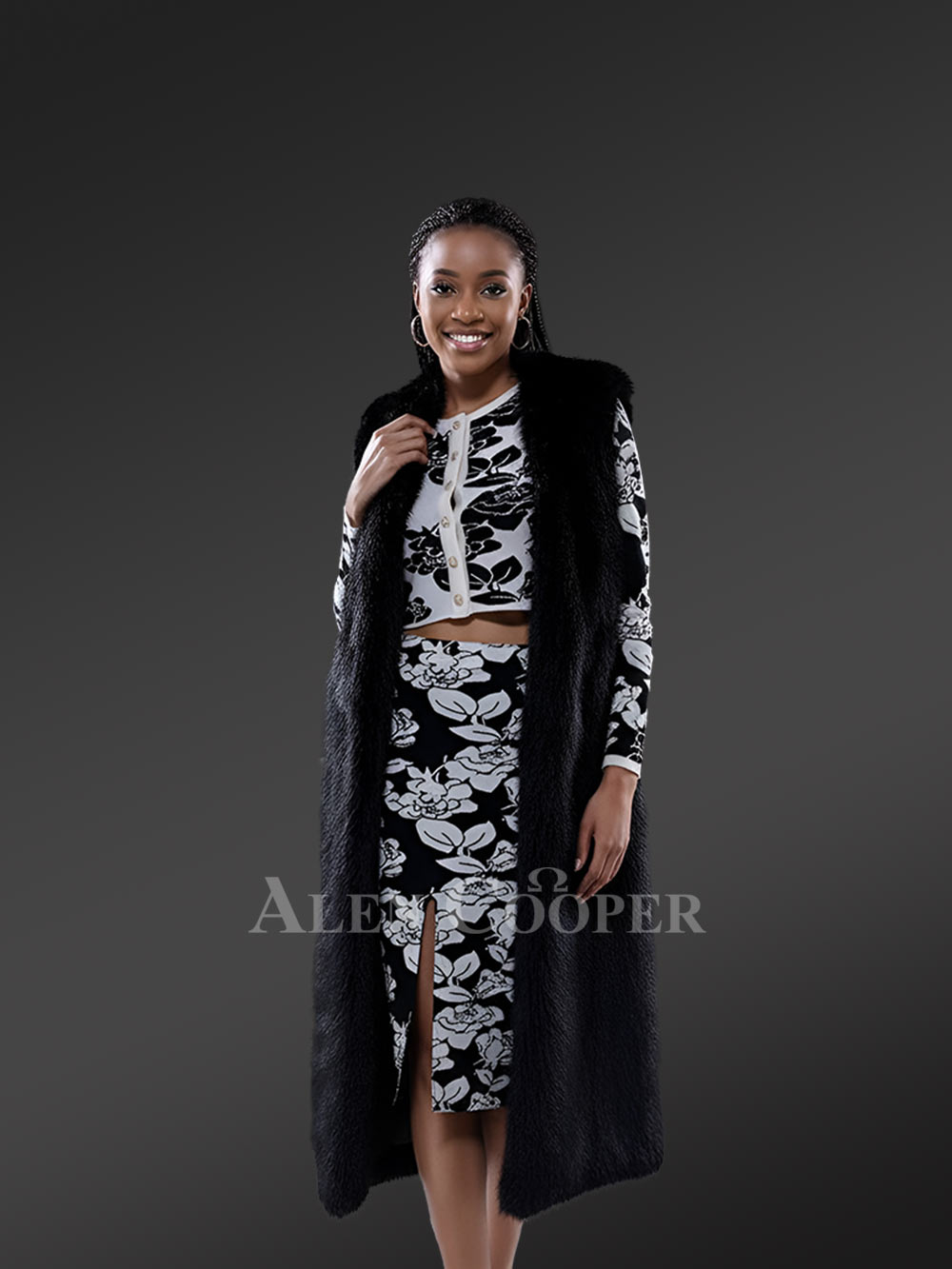This luxurious long vest, crafted from premium black rabbit fur, blends refined style with practical functionality. Its dense yet lightweight fur provides remarkable insulation, enveloping the wearer in natural warmth while remaining exceptionally soft and comforting against the skin. Designed with secure hook-and-eye fasteners, the vest maintains a sleek, uninterrupted silhouette without adding bulk. Slit-style side pockets offer convenient space for essentials while keeping the hands warm during colder days. Completing the design, the silk satin lining enhances comfort with its smooth, breathable feel, ensuring the vest glides effortlessly over any outfit and remains pleasant to wear for extended hours.