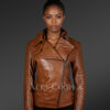Women’s Assymetrical Motorcycle Biker Jacket in Tan with Zipout Collar