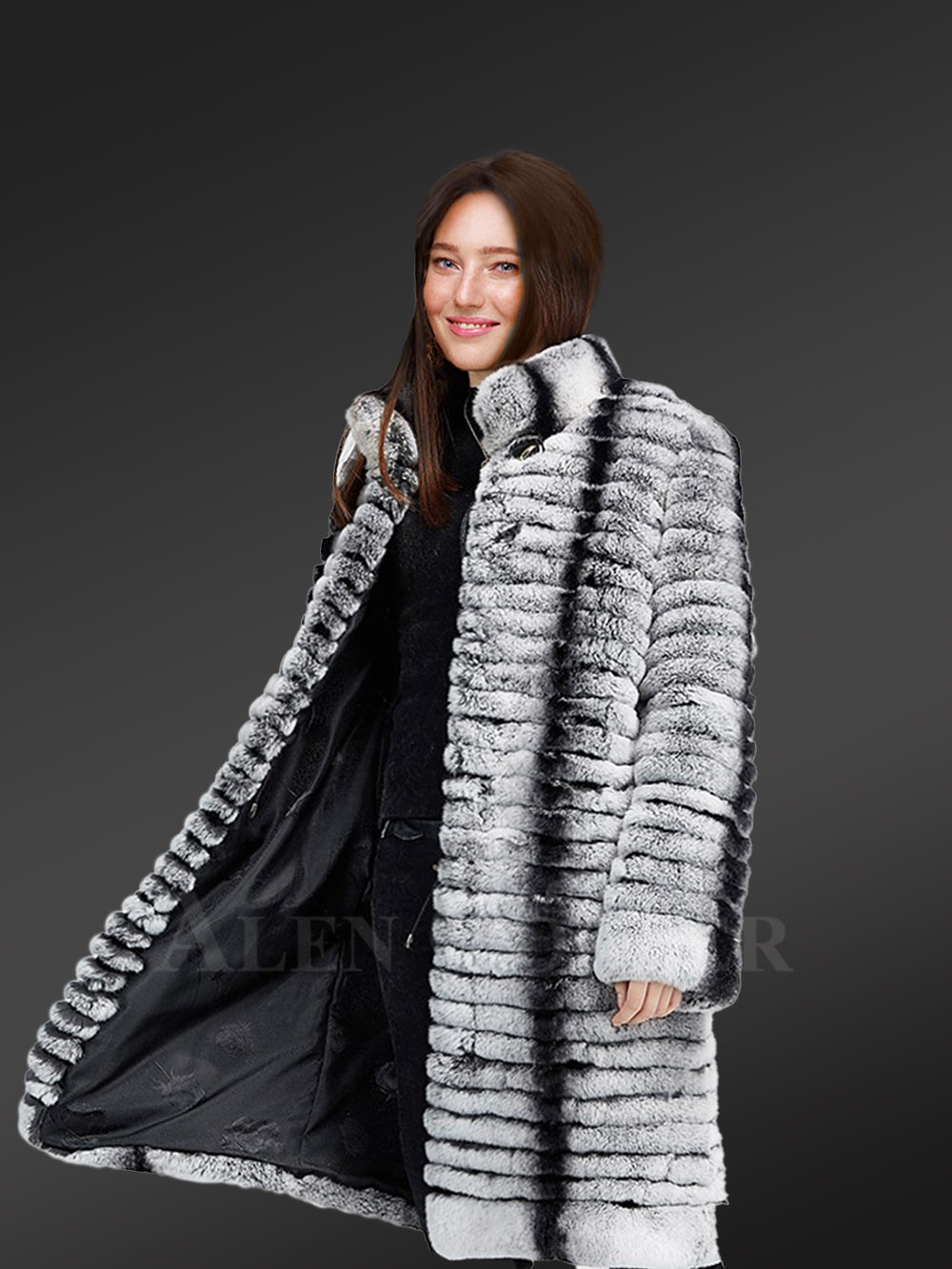 Womens Rabbit Fur High-Neck Coat Looks Chic in Dual Color Chevron Pattern