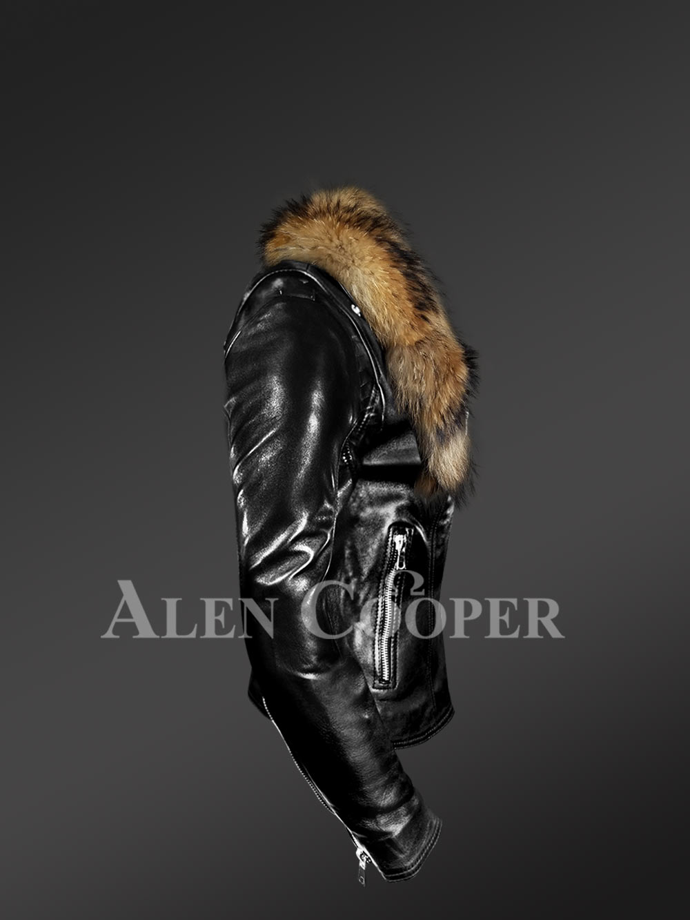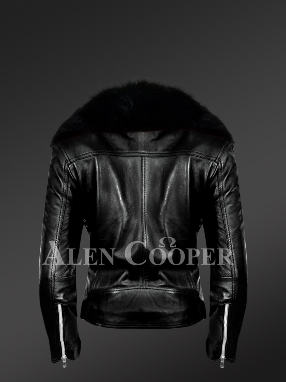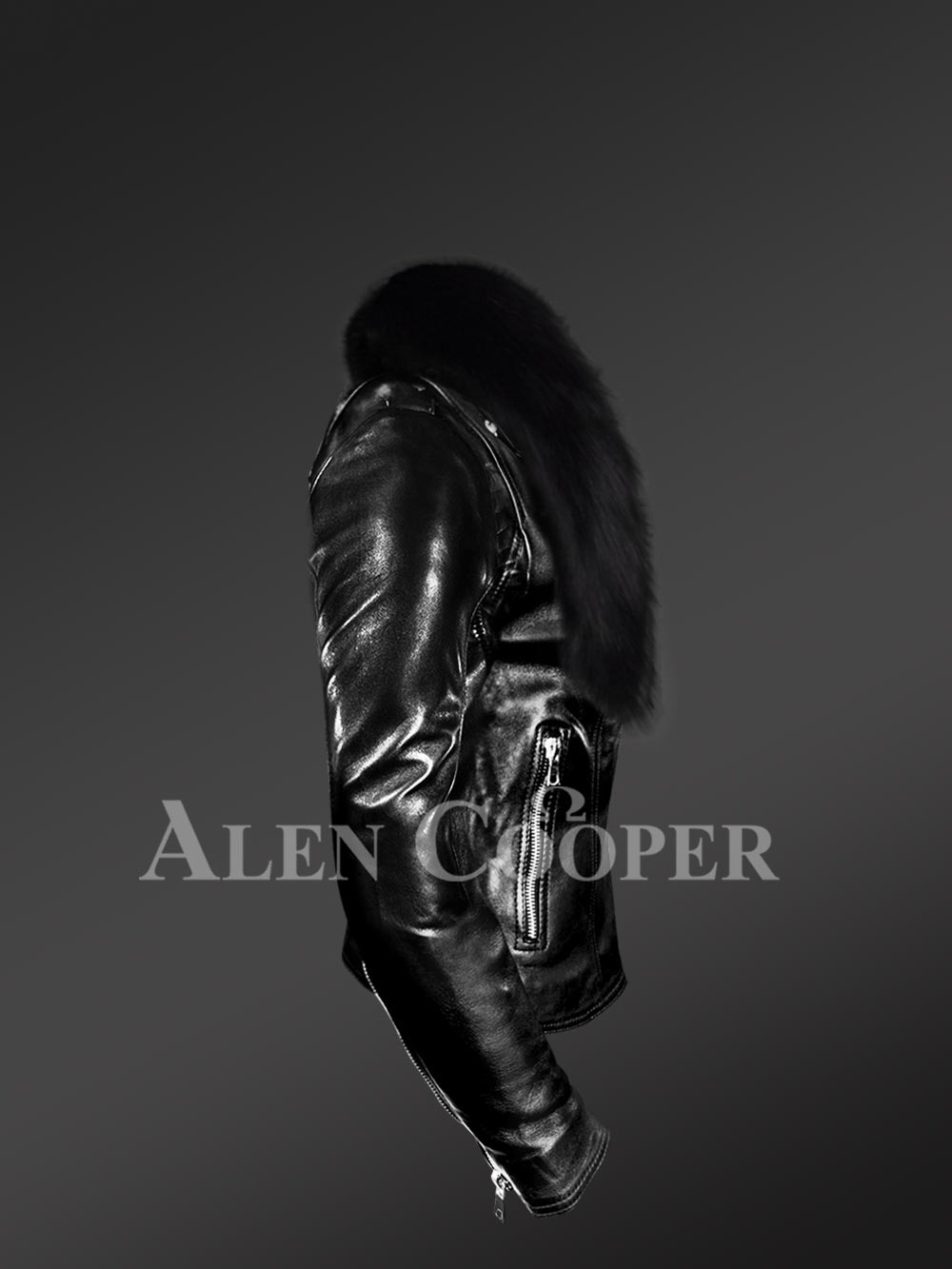 Classy Black Leather Motorcycle Jacket with Detachable Black Fox Fur Collar