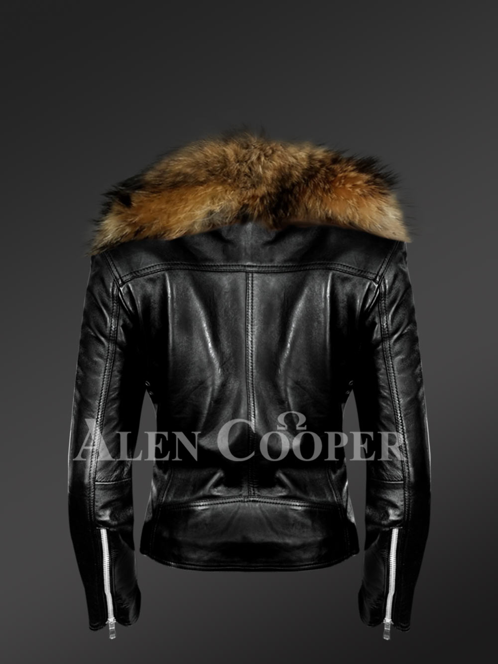 Women’s Chic Black Moto Jacket with Zip-Out Removable Fox Fur Collar