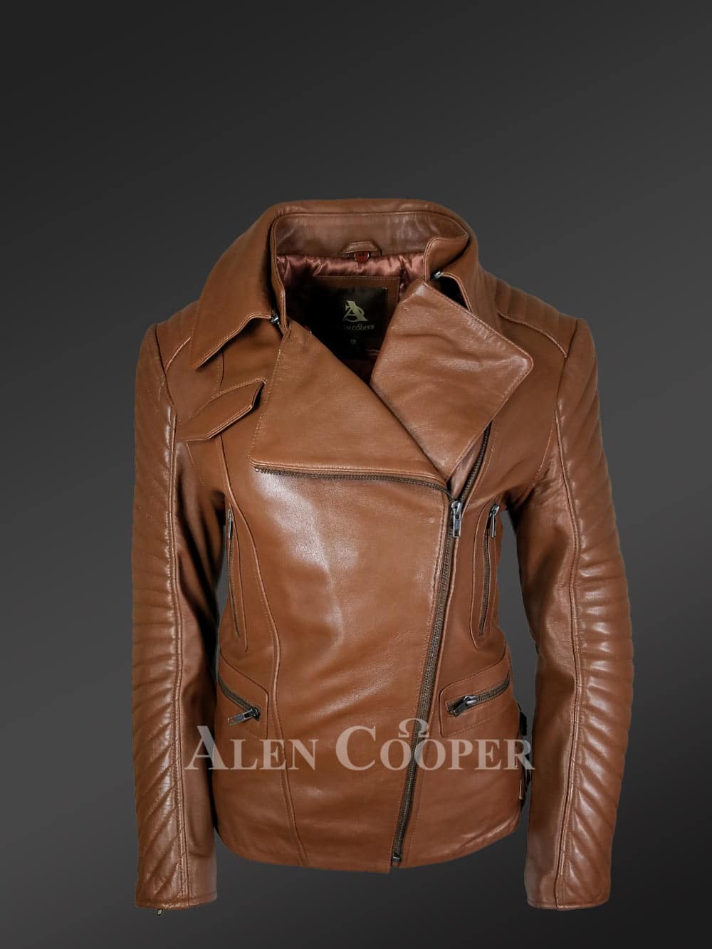 Women’s Assymetrical Motorcycle Biker Jacket in Tan with Zipout Collar