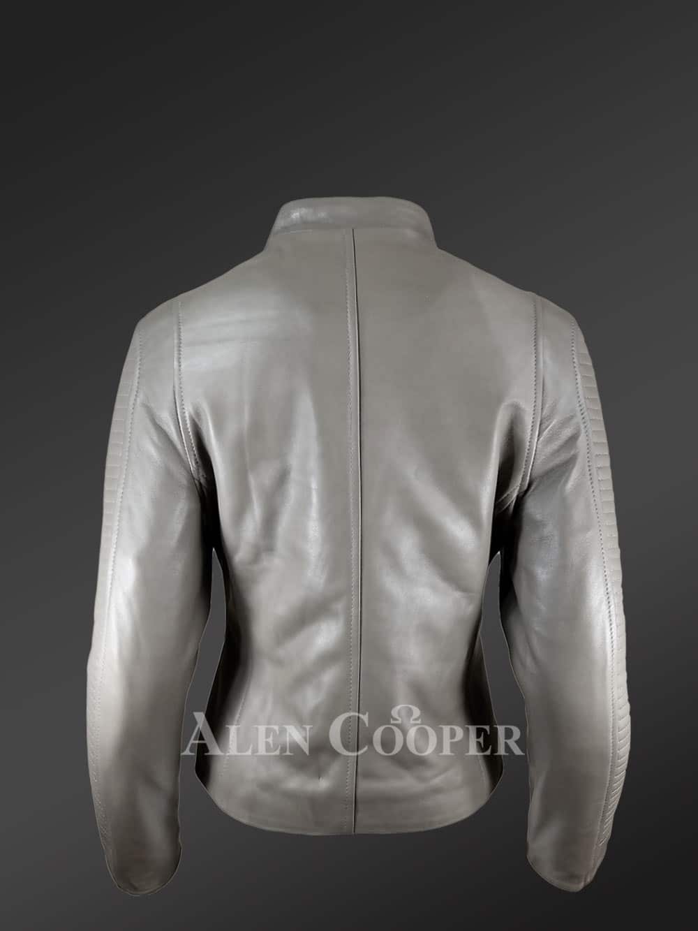 Womens Grey Leather Motorcycle Jacket with Zip Fastenerson Both Sides