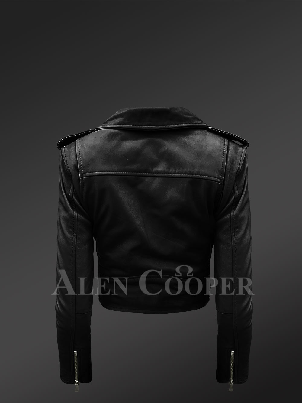 Women’s Short Length Real Leather Black Biker Jacket with Asymmetrical Zipper Closure