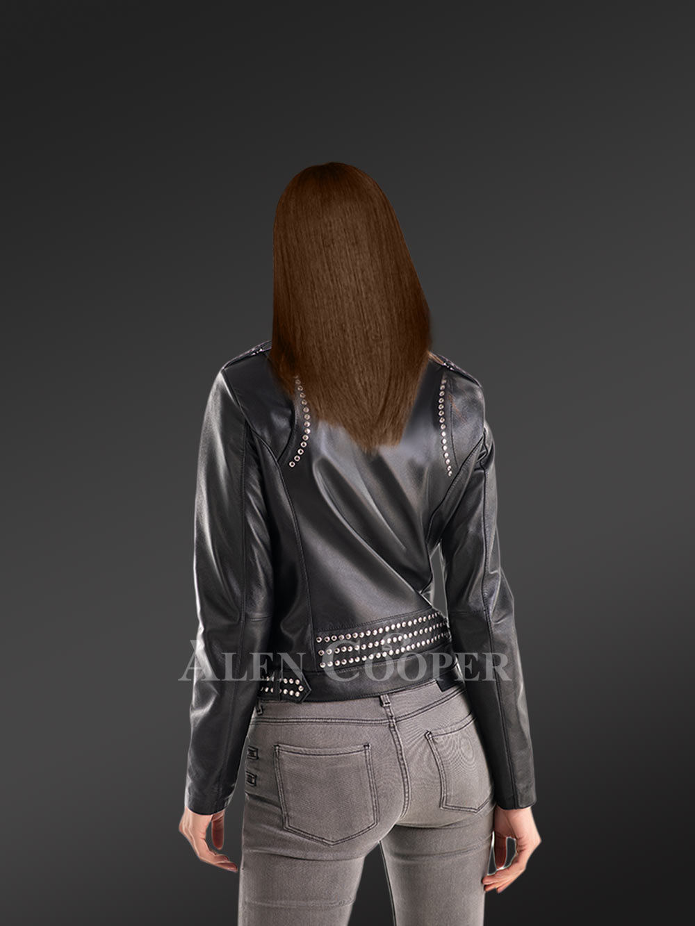 Ladies’ Leather Jacket in Black with rivets and asymmetrical zip-lock closure