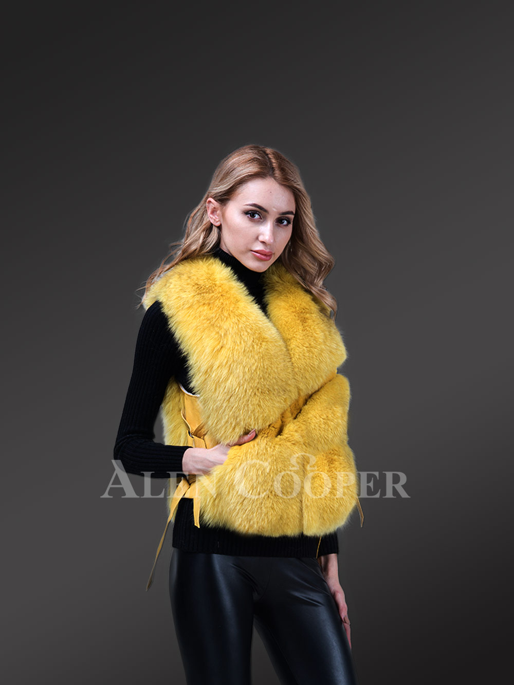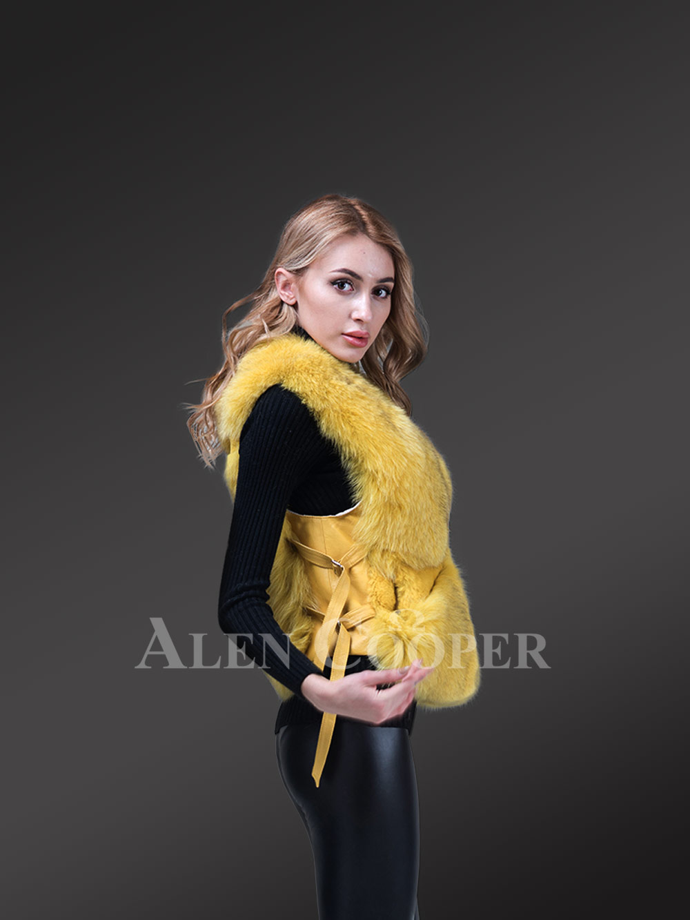 Sleeveless Fox Fur Womens Vest in Yellow- Glamorizing the Wintry Mood