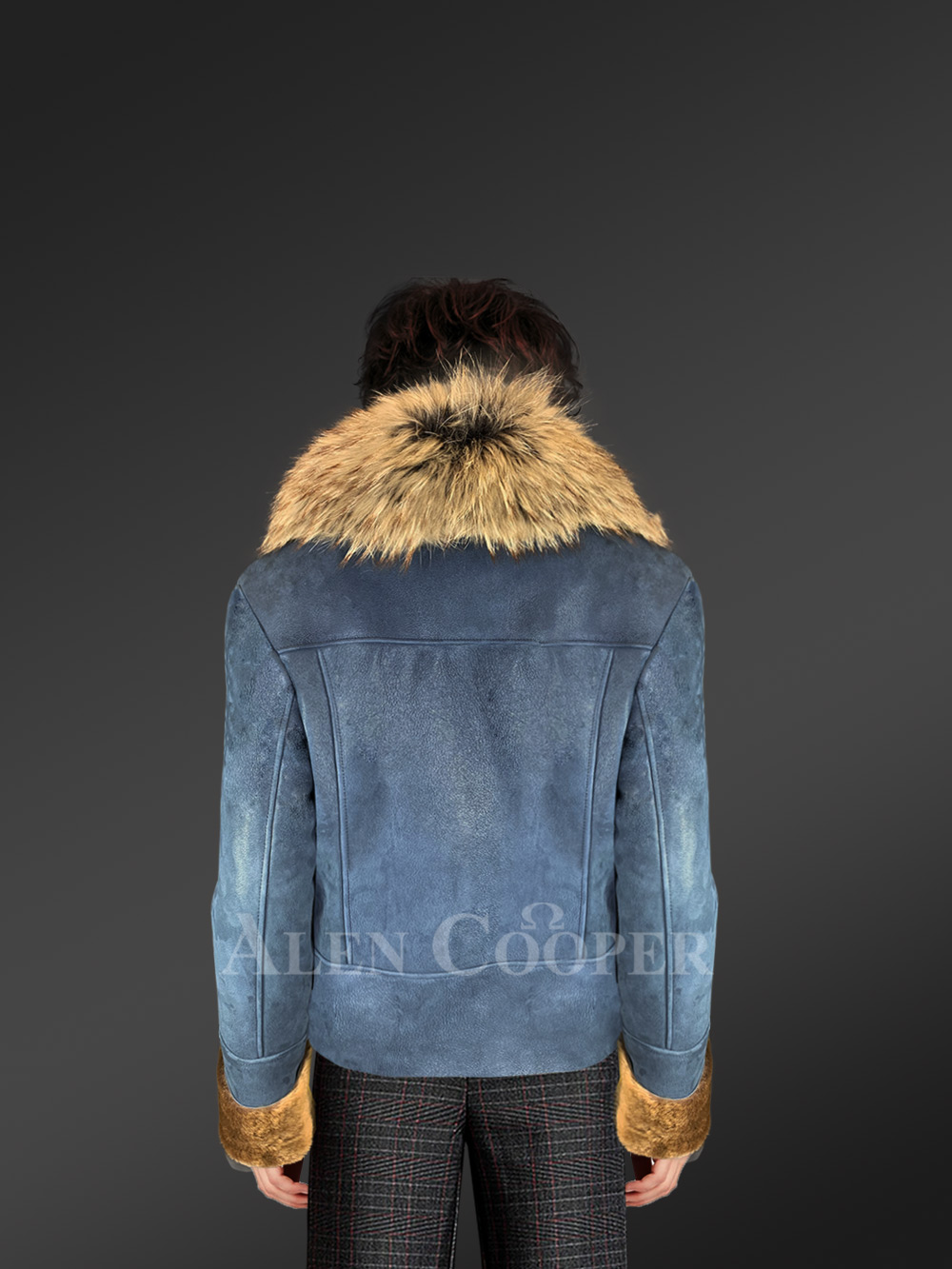 Women’s Biker Style Merino Shearling Jacket in Ice Blue