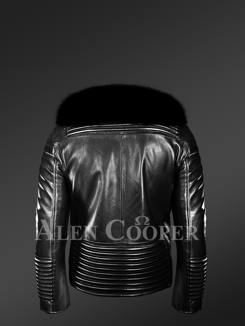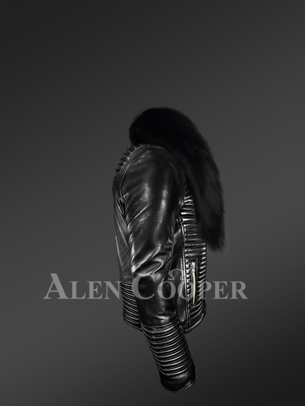Men’s Sturdy Black Biker Jacket with Leather Ribs and Black Fox Fur Collar