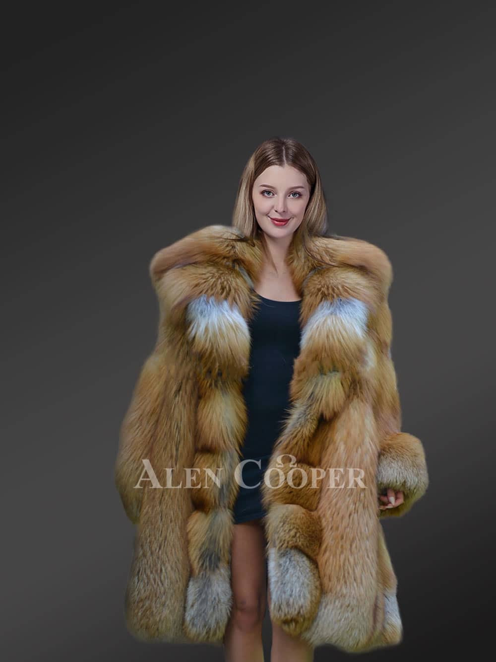 Womens Original Red Fox Fur Coat with an Exquisite Front Trim Line