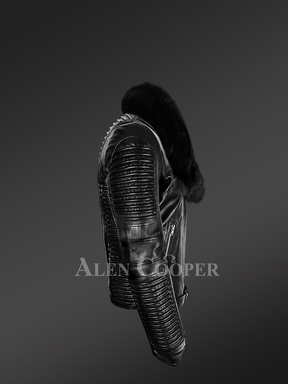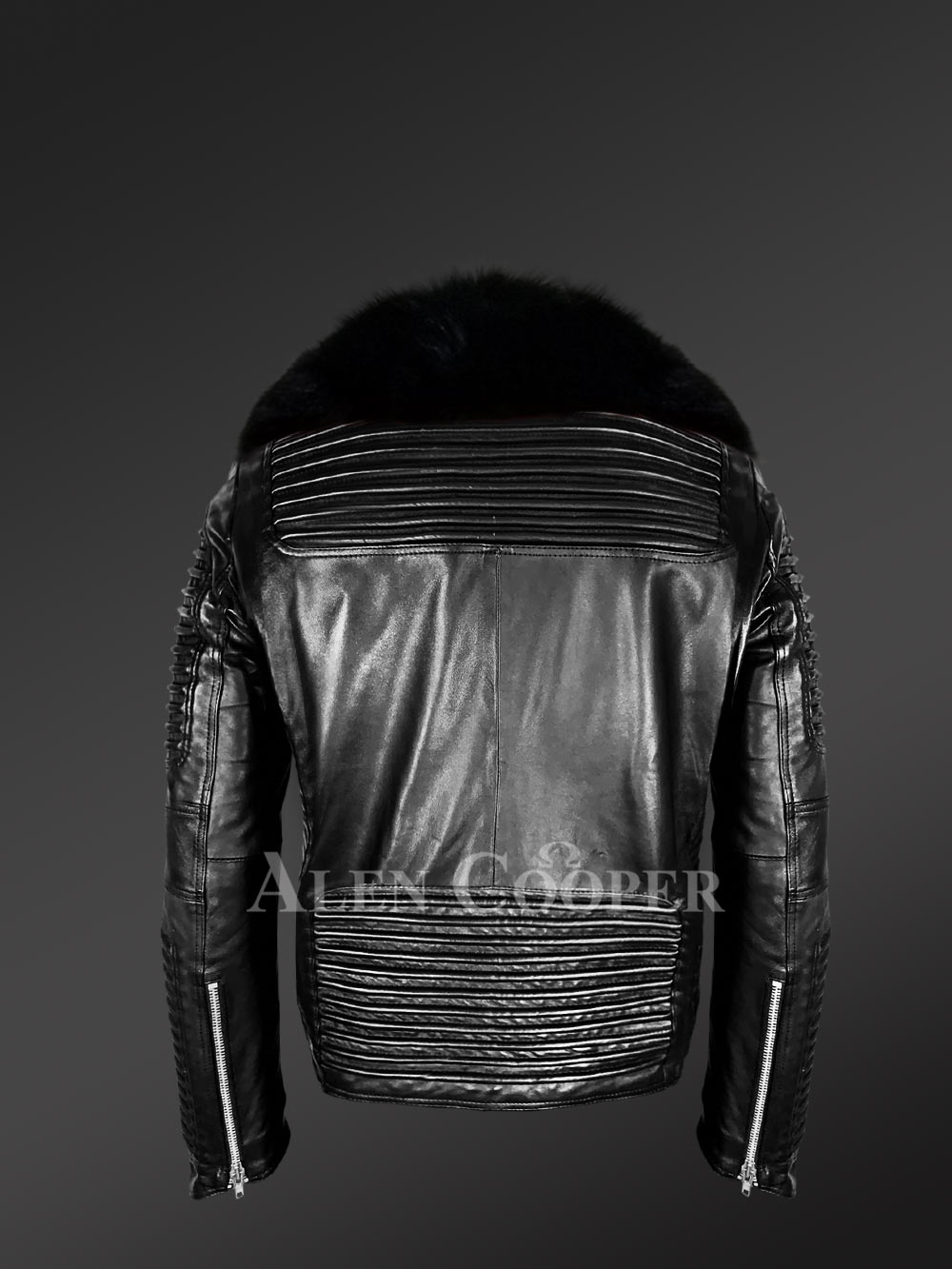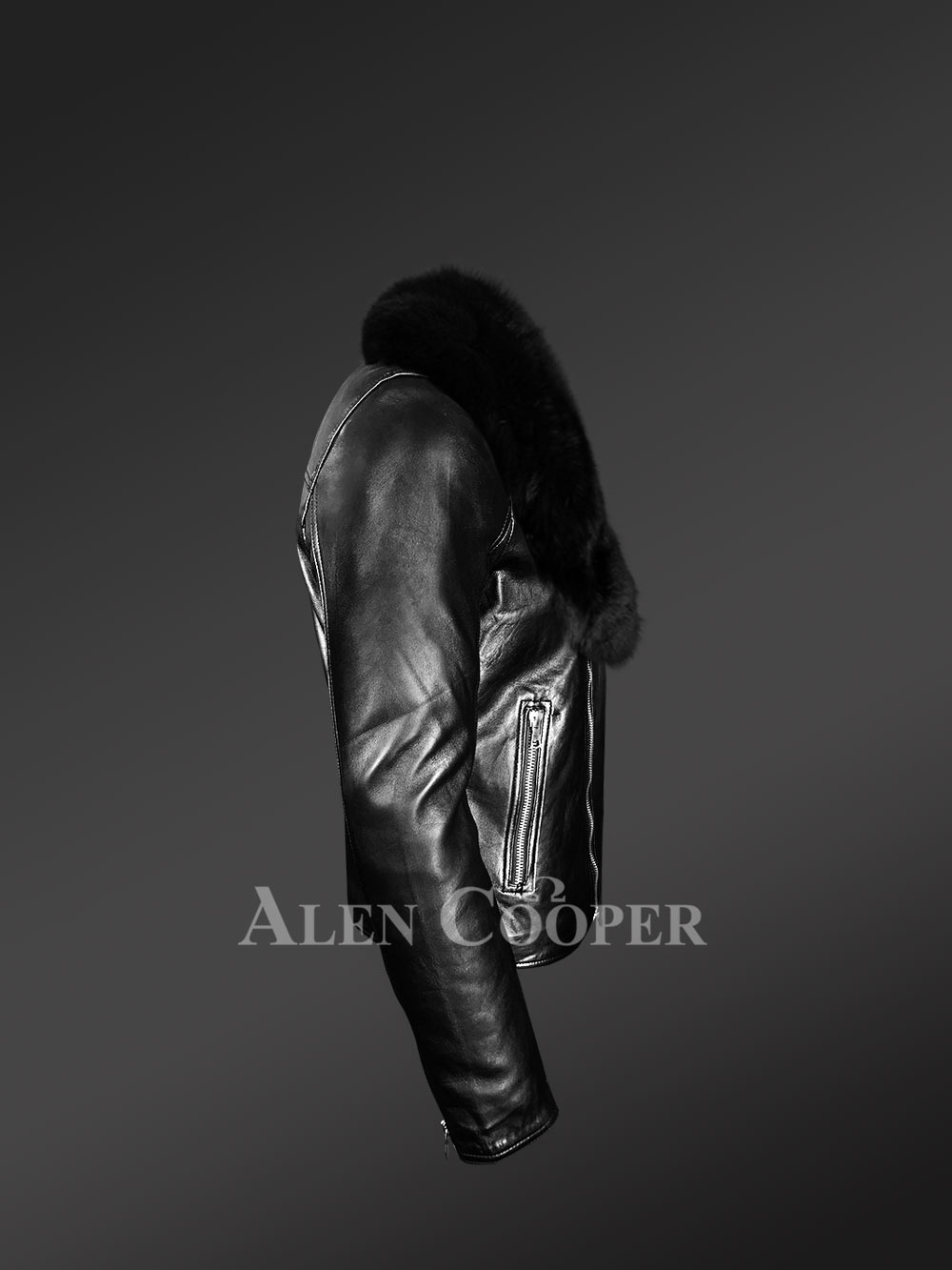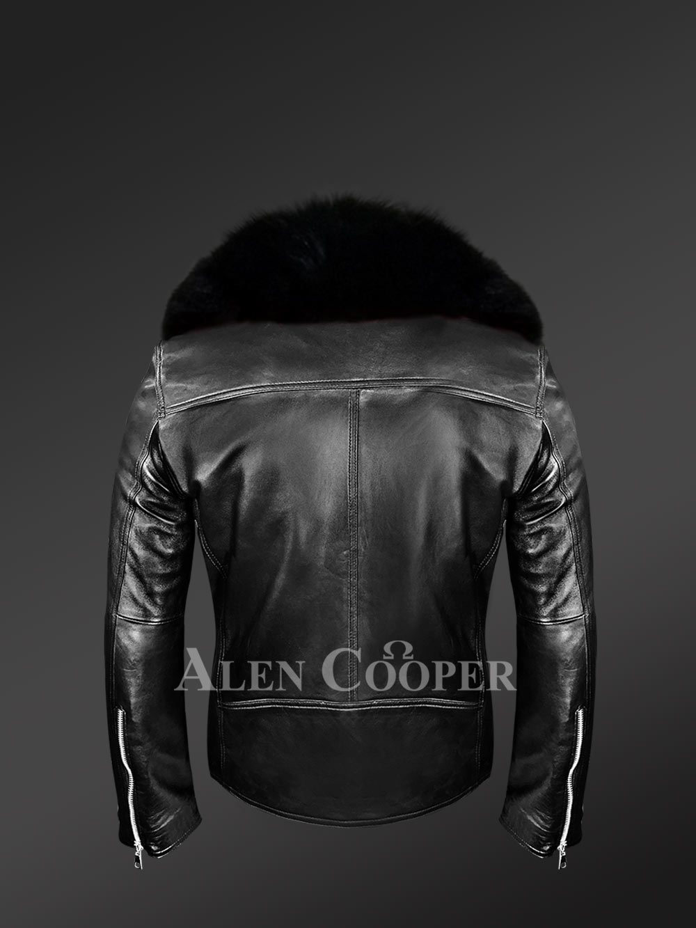 Black Motorcycle Leather Jacket with Fox Fur Collar for Men
