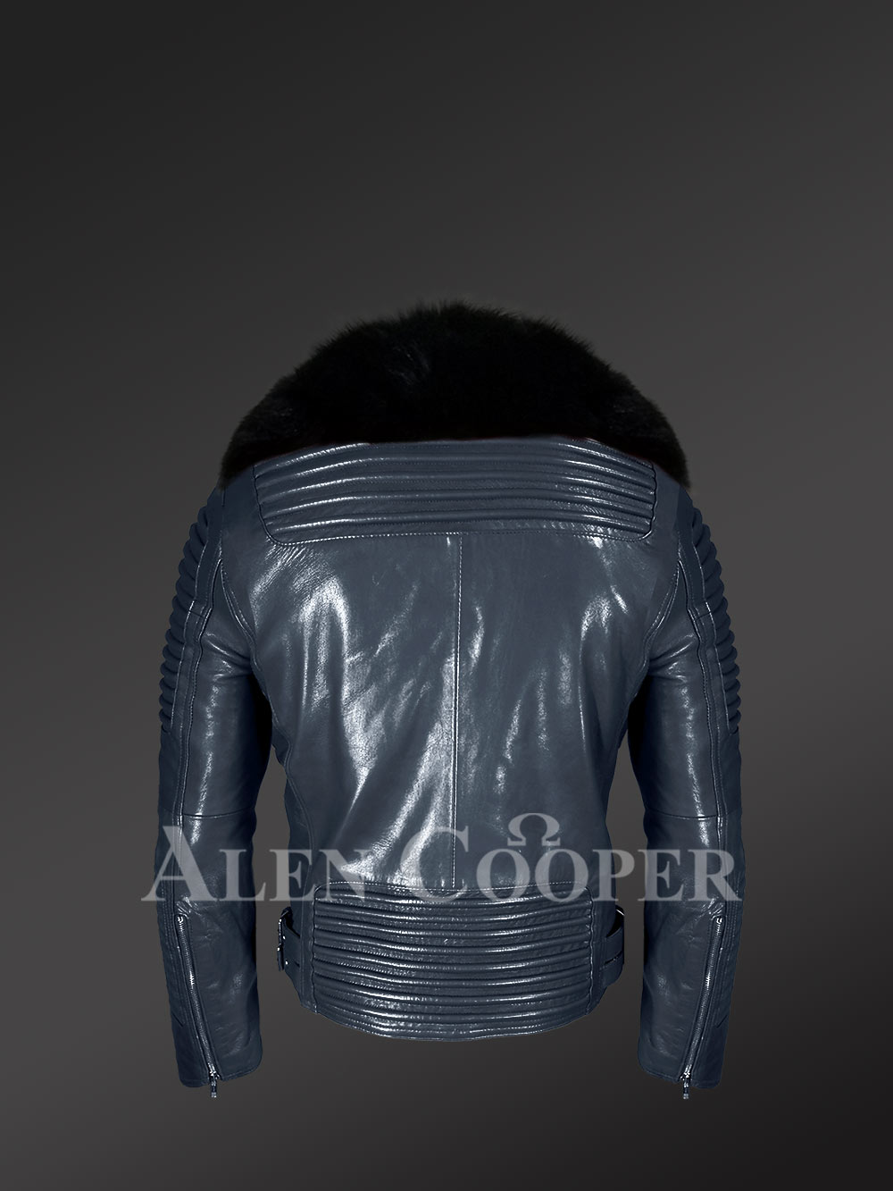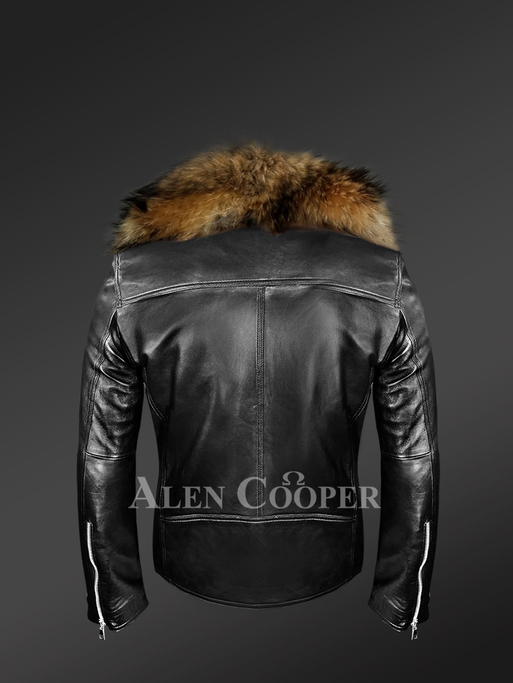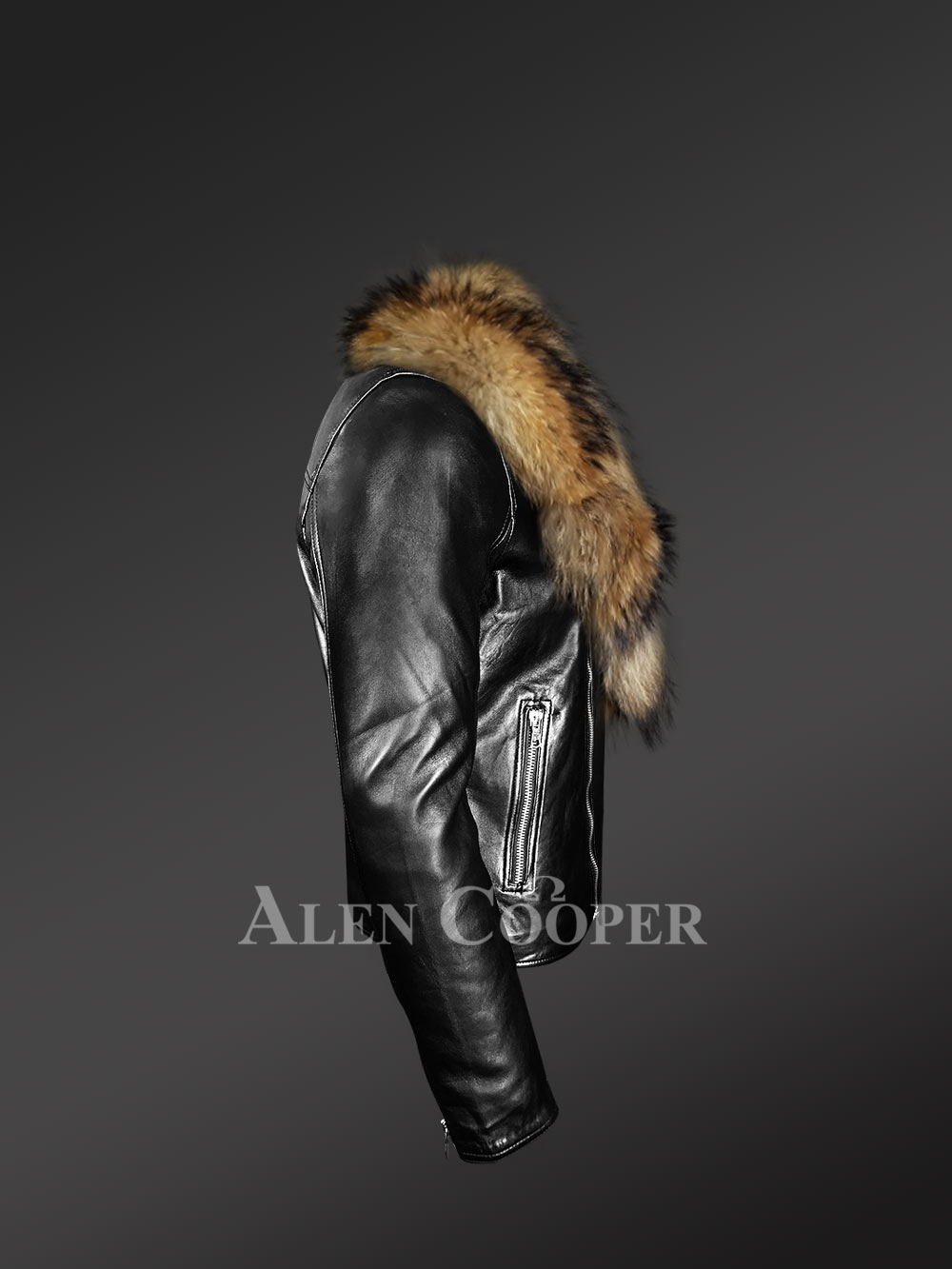 Mens Biker Jacket with Detachable Raccoon Fur Collar