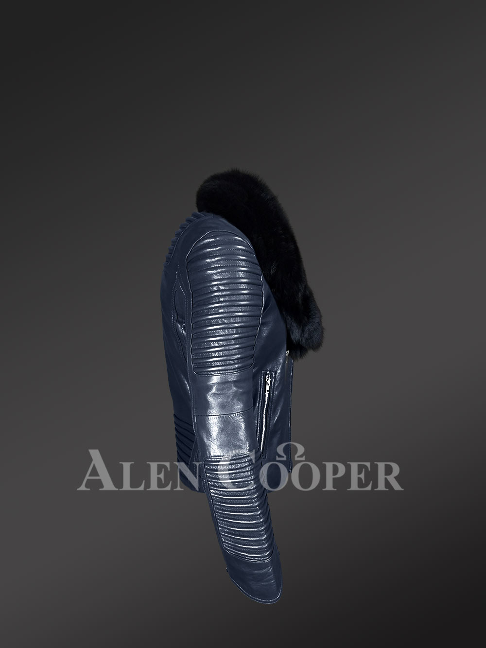Navy Blue Biker Jacket with Black Fox Fur Collar