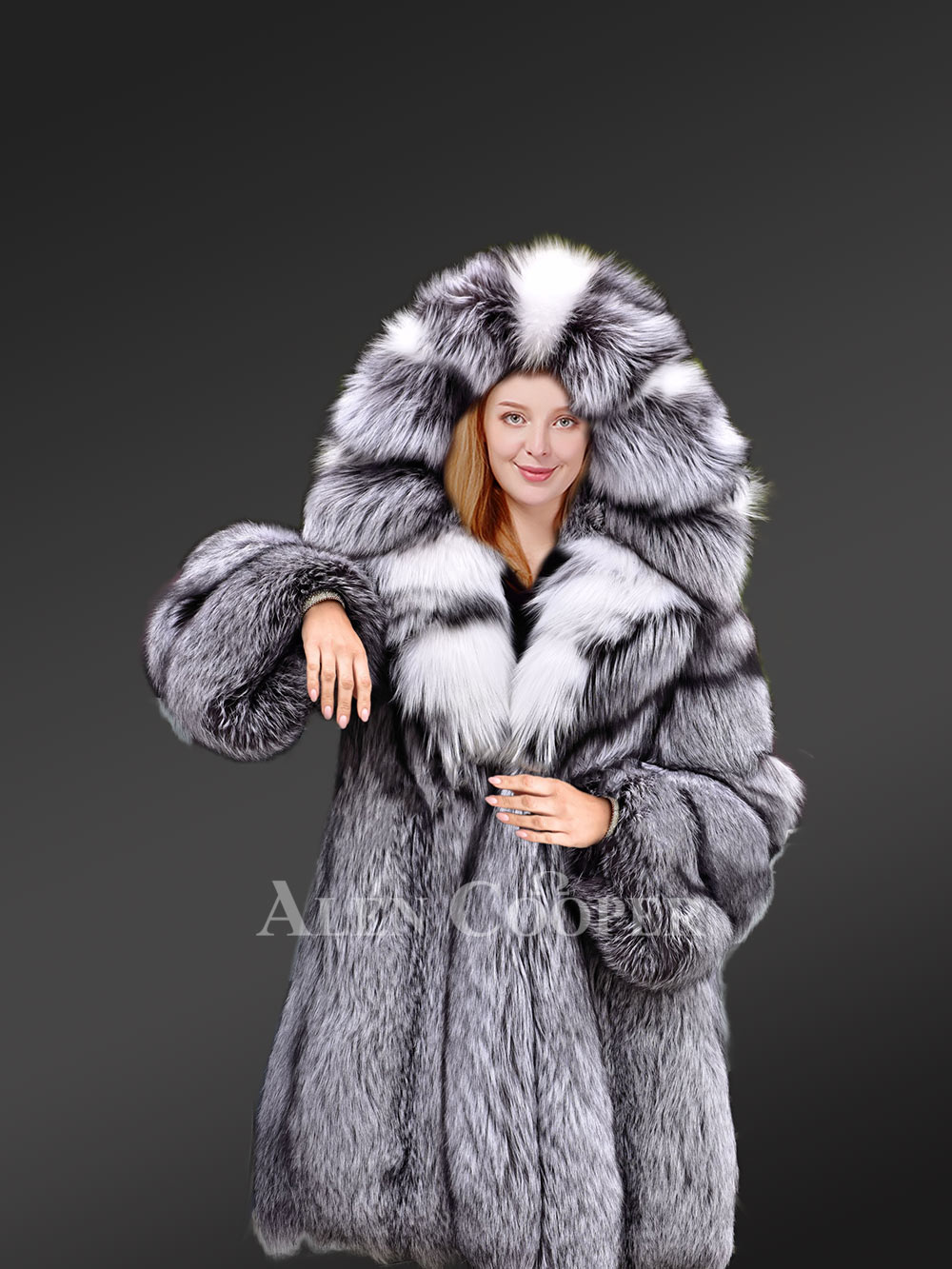 Hooded Silver Fox Fur Long Coat for Women