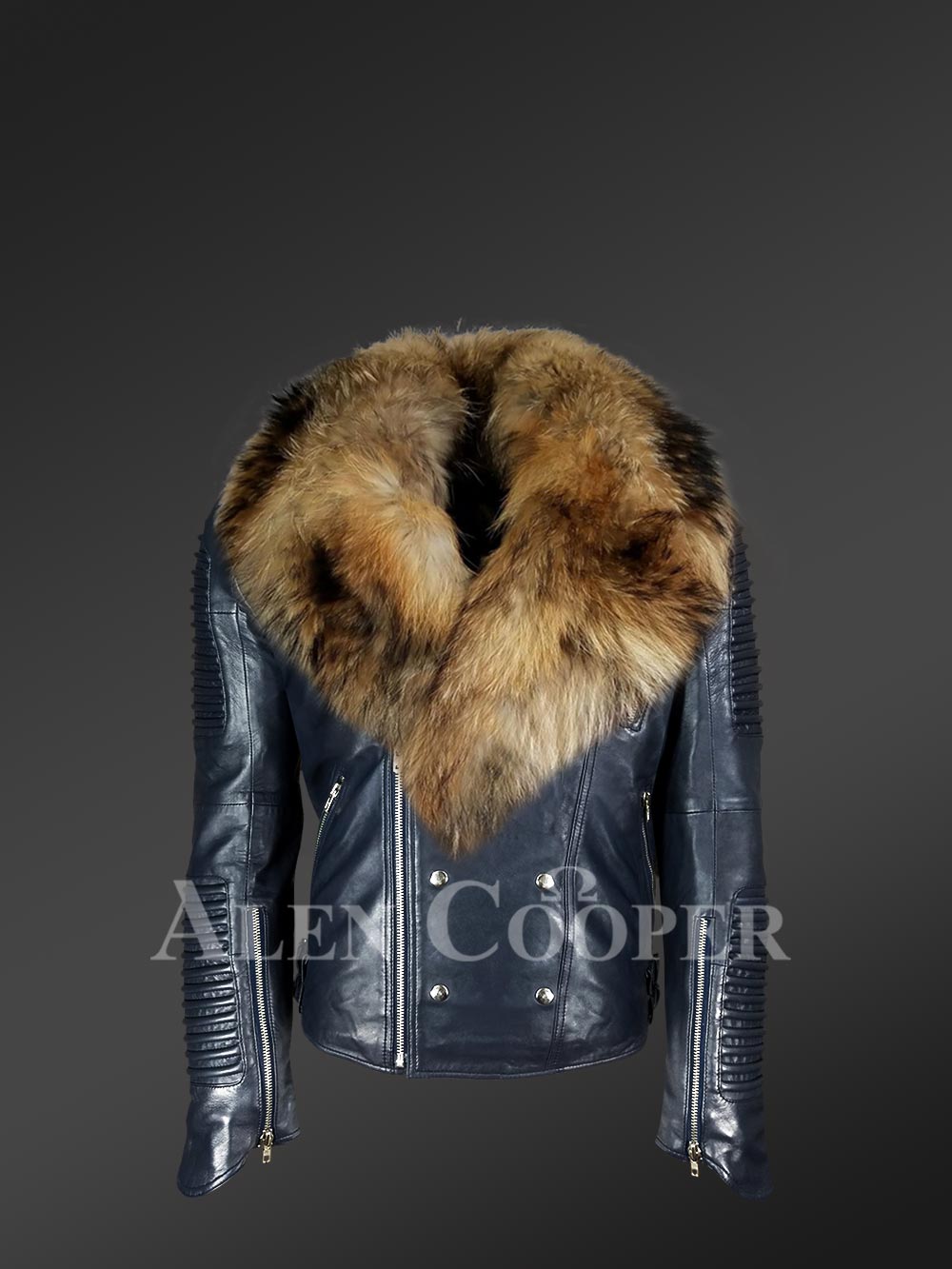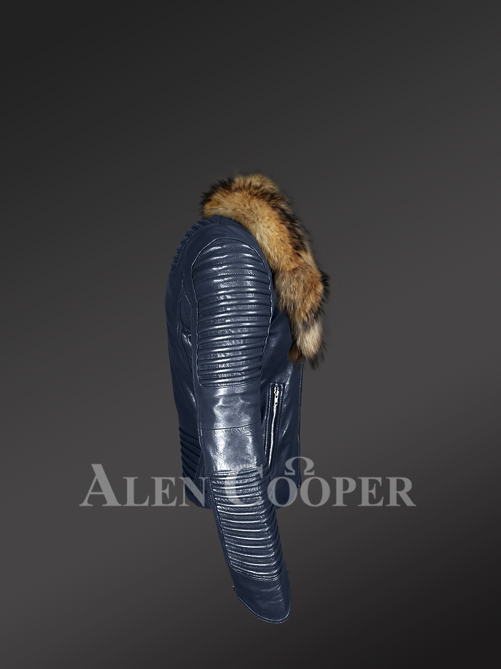 Navy Blue Leather Jacket with Fur Collar for Men