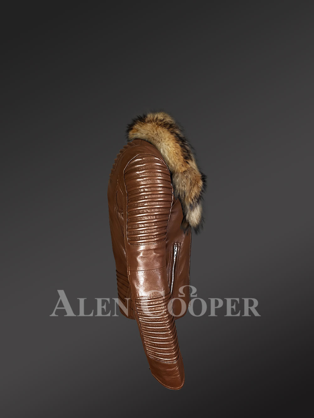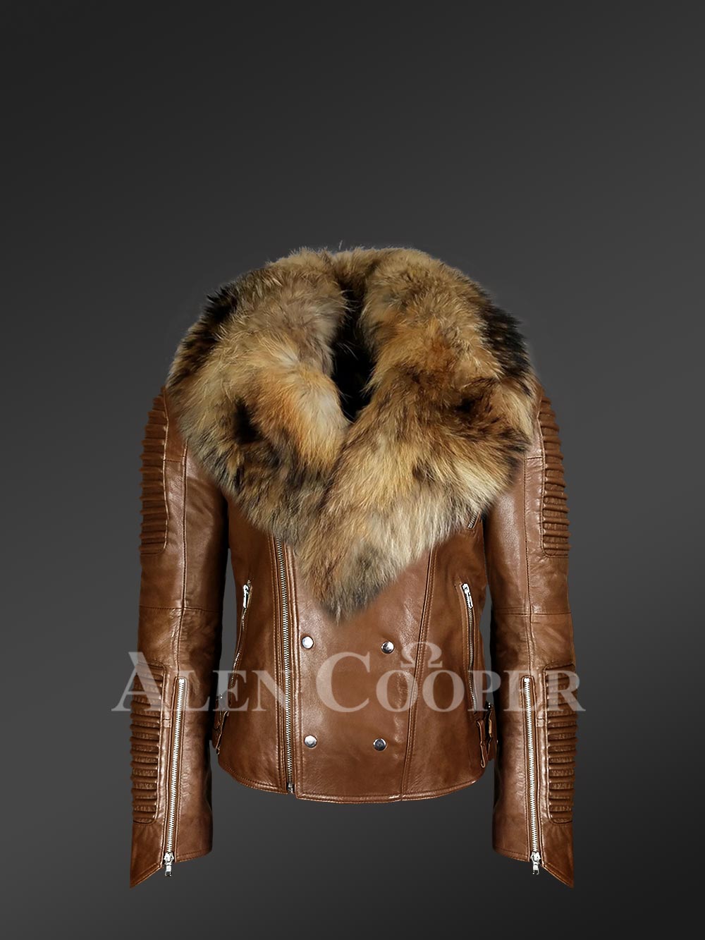Tan Leather Jacket with Raccoon Fur Collar