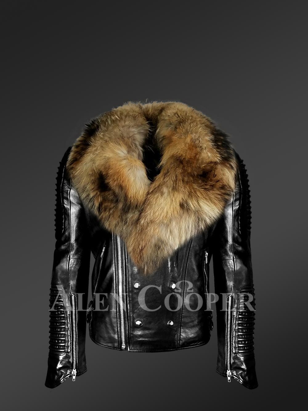 Biker Leather Jacket with Crystal Fox Fur Collar