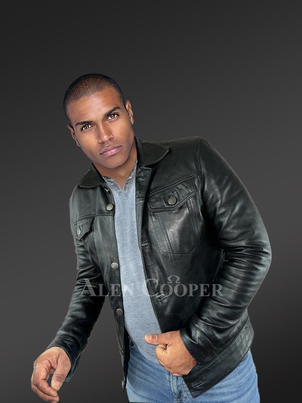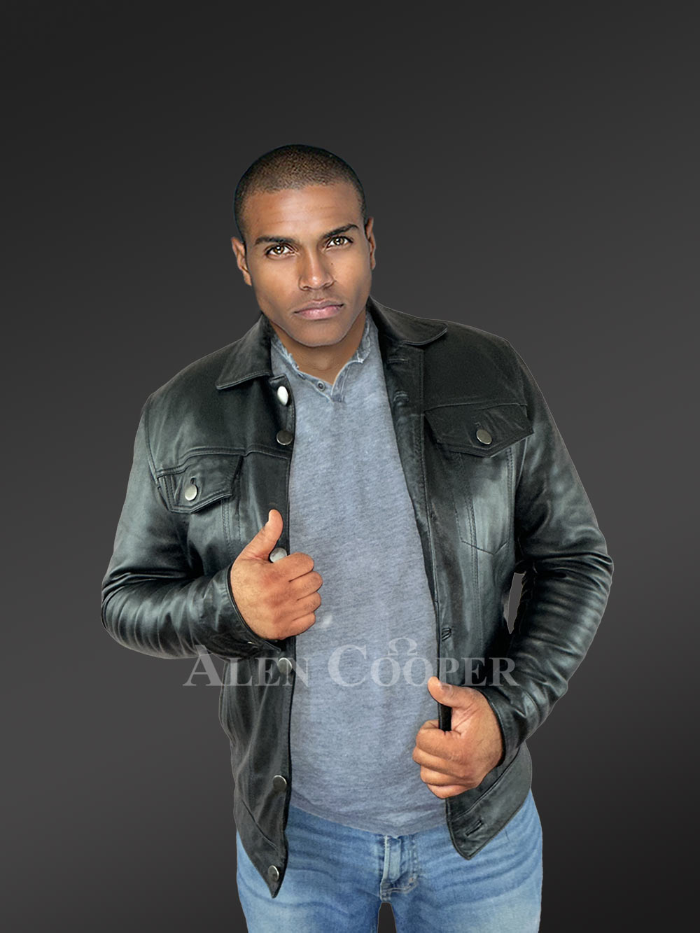 Men’s Button Down Italian Finish Leather Jacket in Black