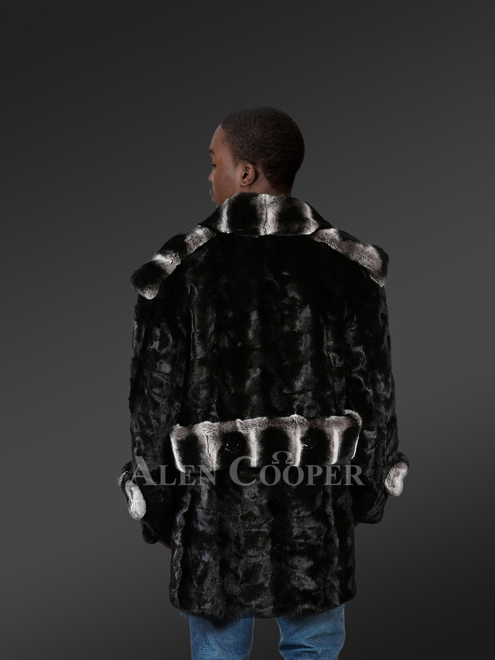 Mens stylish black mink coat with modish lapel of Rex Rabbit fur