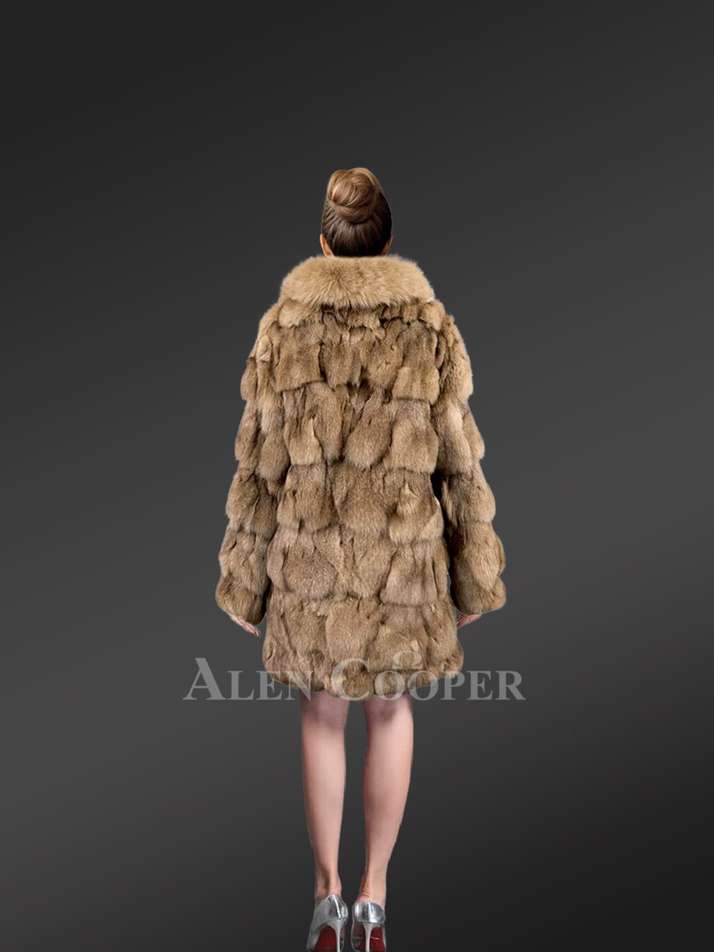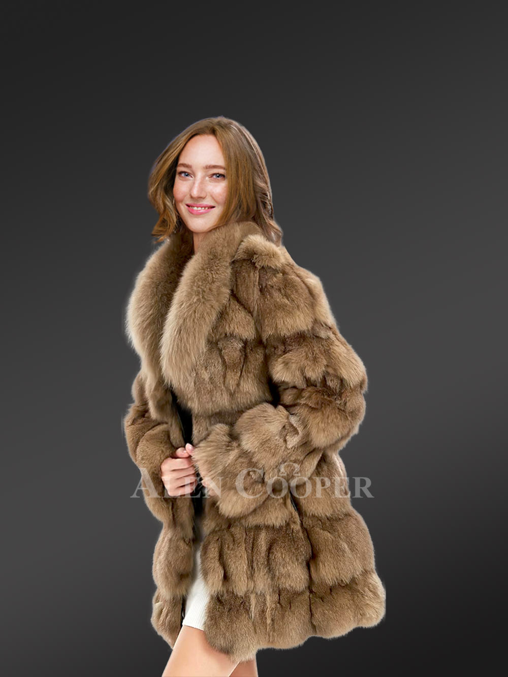 Women’s Mid Length Fox Fur coat with Fox Fur Collar in Brown