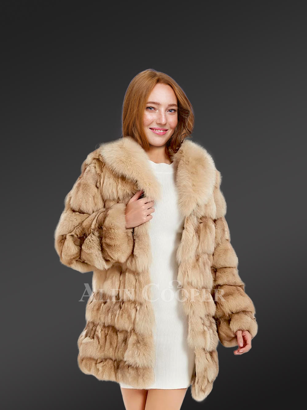 Women’s Mid Length Fox Fur coat with Fox Fur Collar in Beige