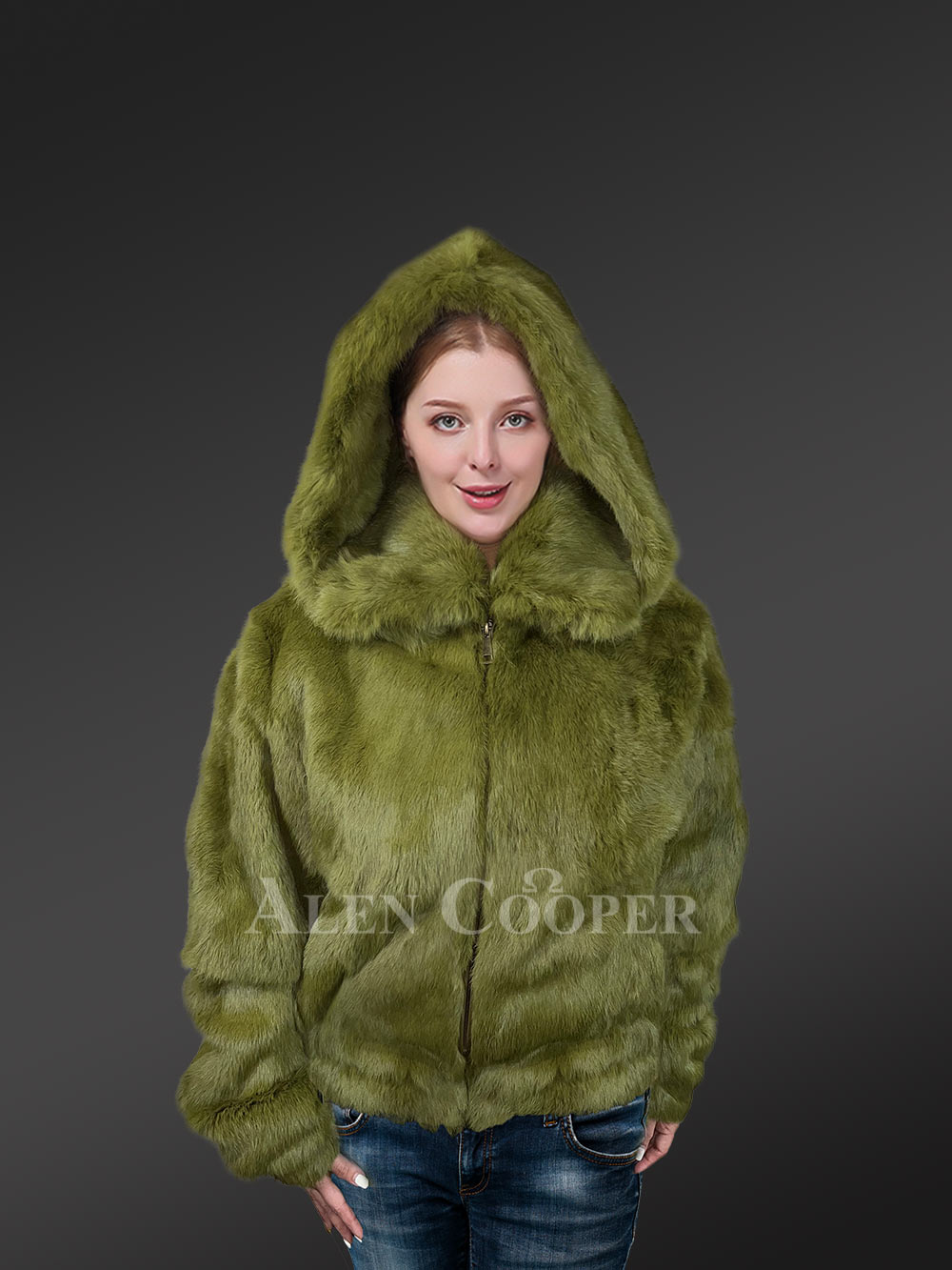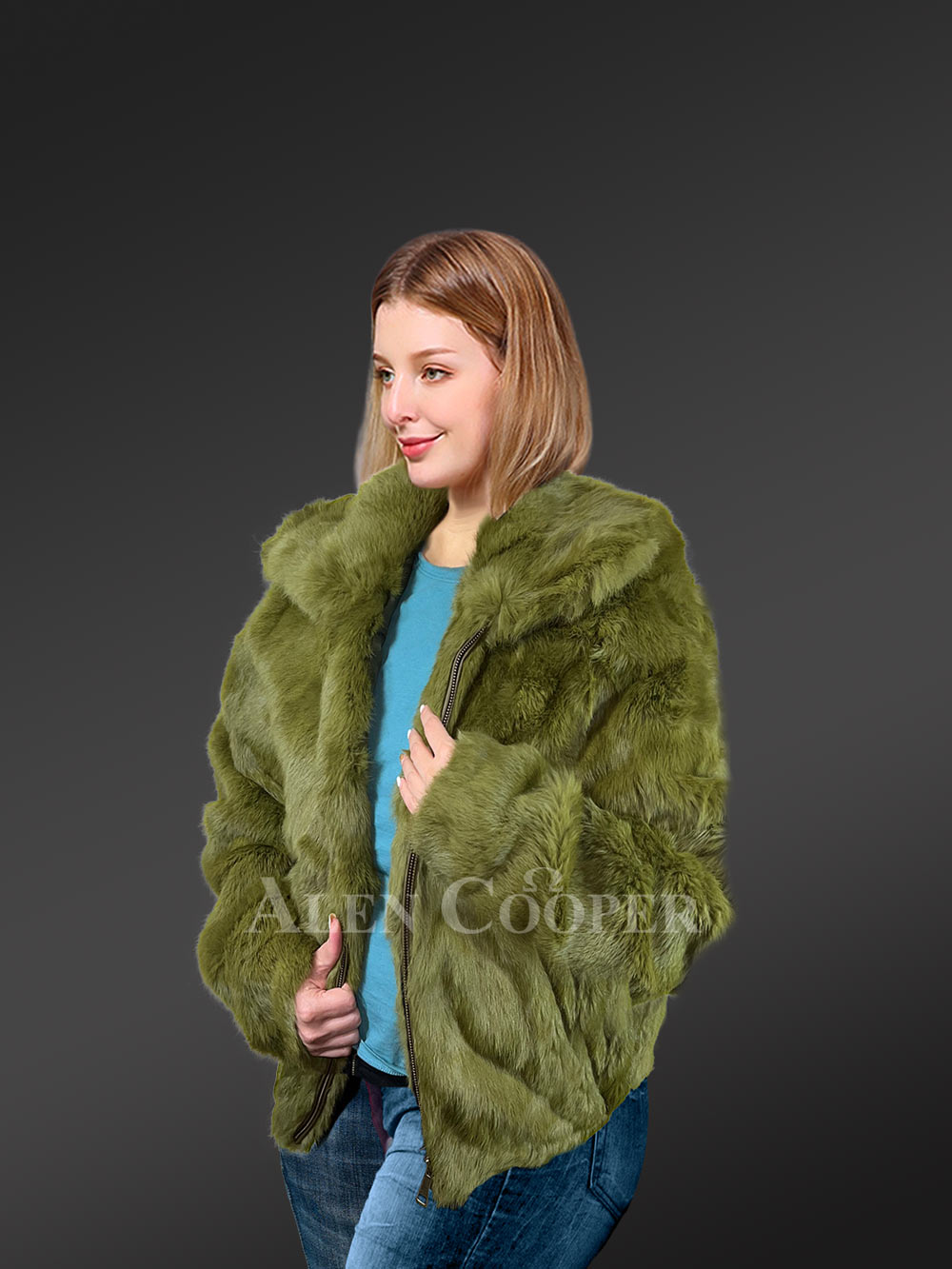 Women’s Authentic Rabbit Fur Bomber Jacket in Olive