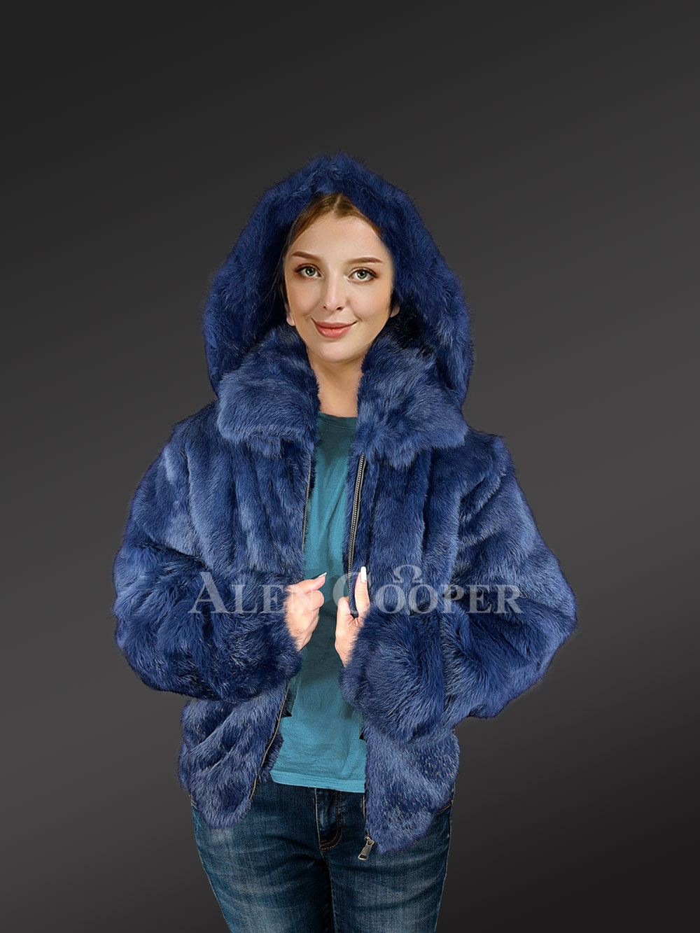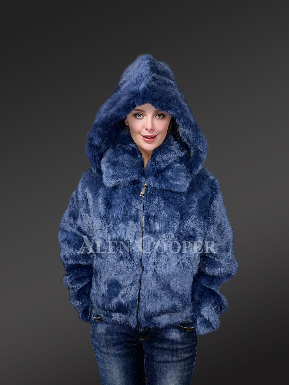 Navy Blue Rabbit Fur Jacket with a Hood for Women