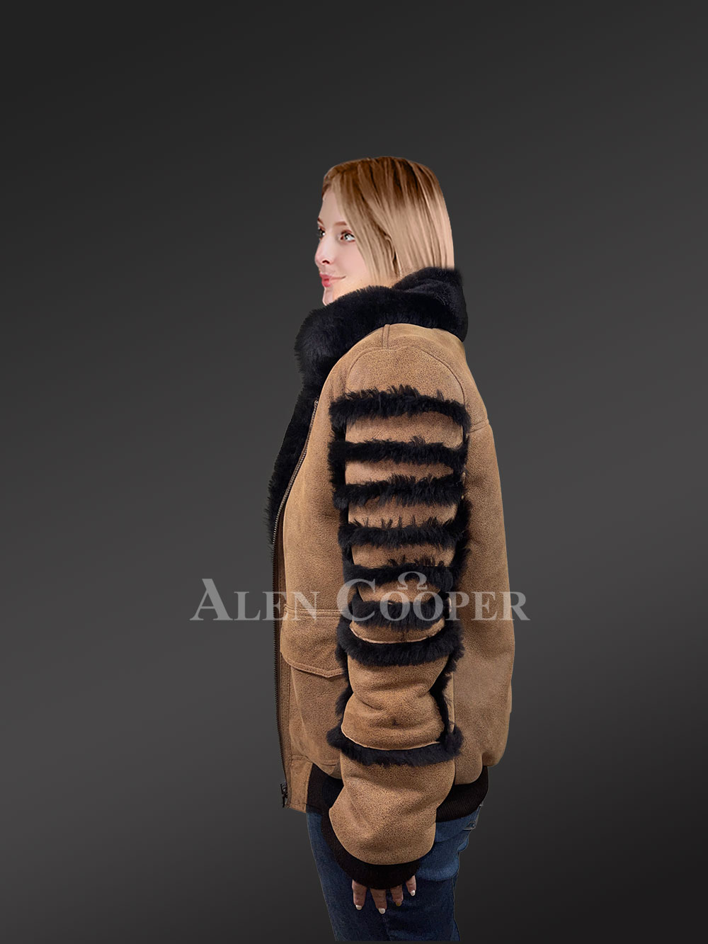Women’s Light Tan Sheepskin Shearling Bomber Jacket Front-open Zipper