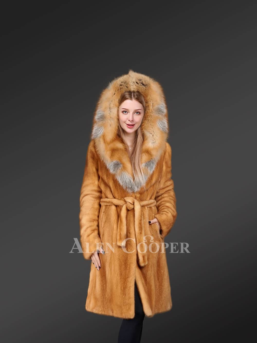 An Elegant Quarter-Length Golden Mink Fur Coat with Red Fox Fur Trim Collar for Women