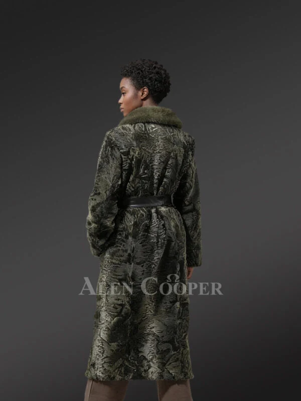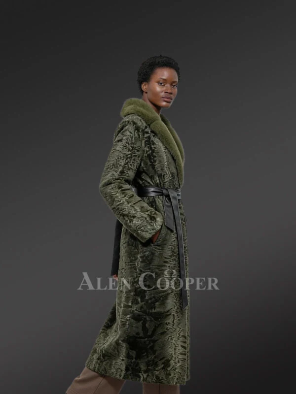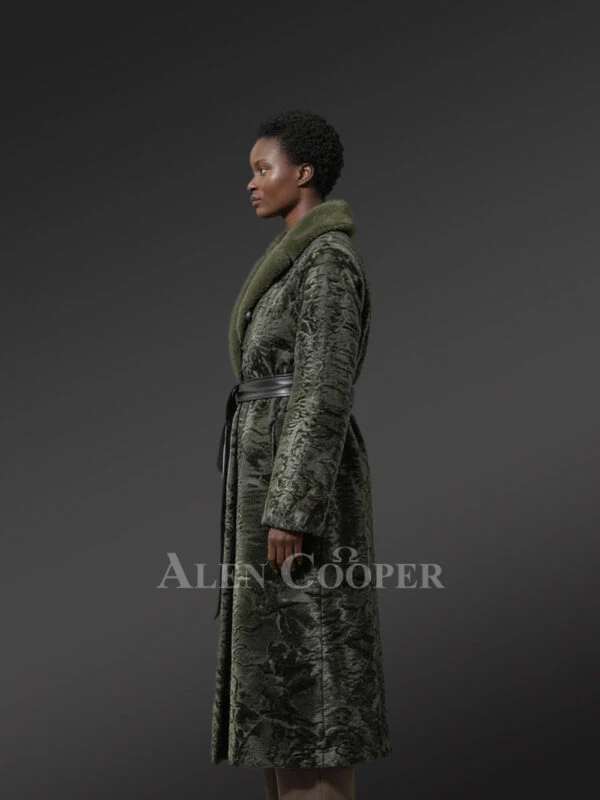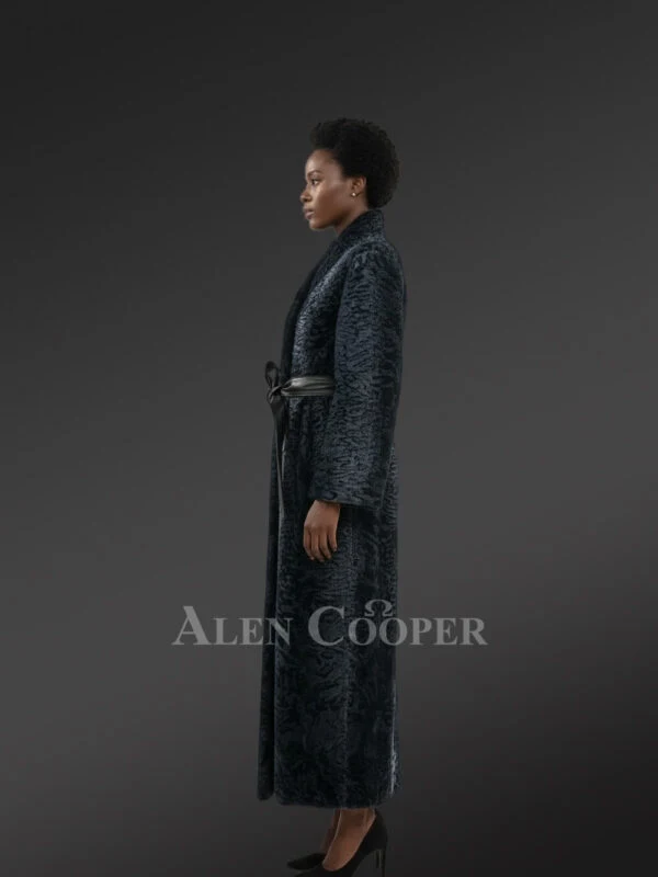 Women’s Full Length Persian Lamb Coat with Belt and Mink Collar Accent