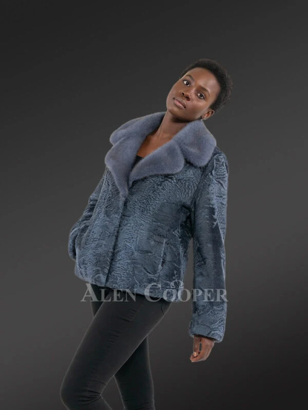 Women’s Lapel Collar Blazer in Persian Lamb with Mink Collar Accent in Grey