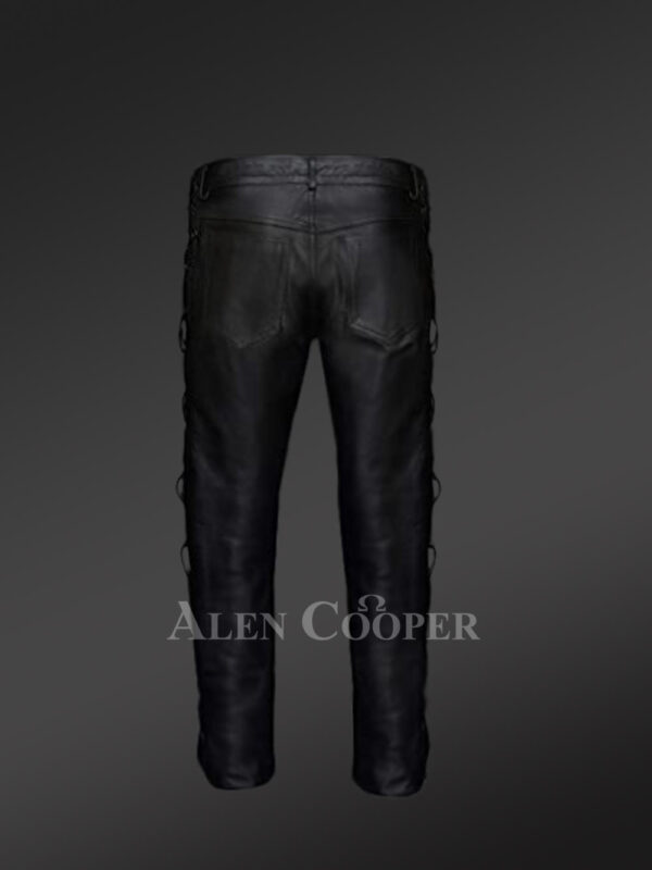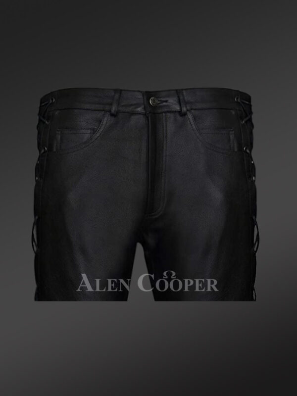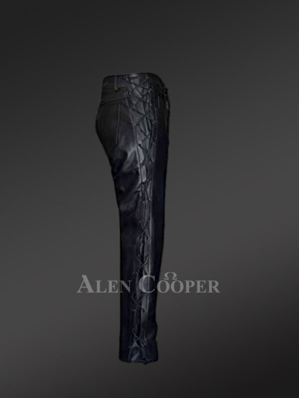 Leather Pants in Jet Black with Unique Criss-Cross Pattern Styles on Sides