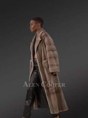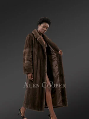 Women’s Mink Long Coat with Belt In Mahoghany Brown
