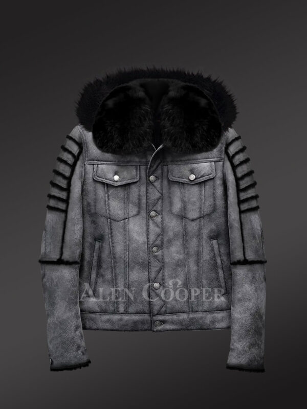 Men’s Shearling Coat in Grey With Black fox fur and Hood