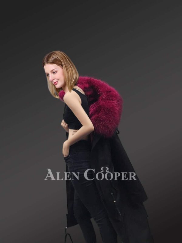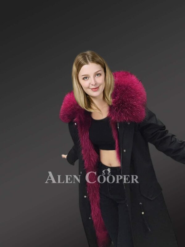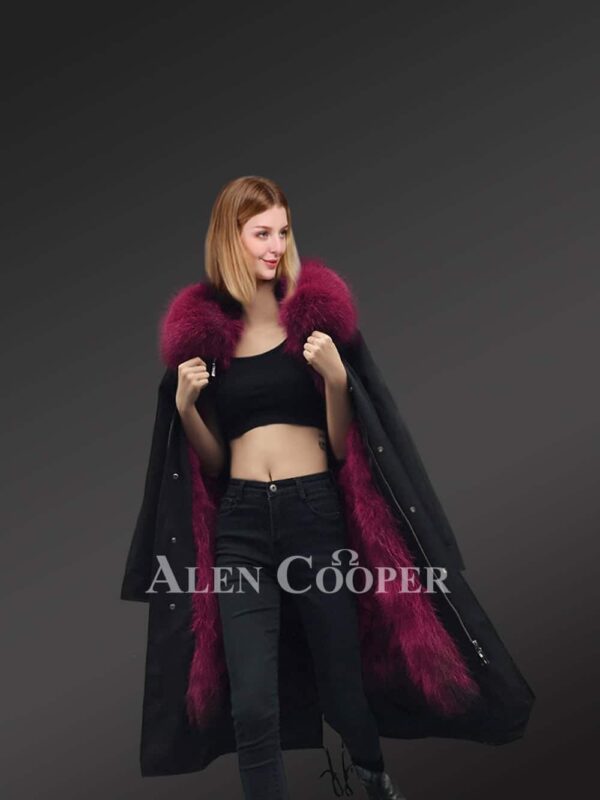 Women’s Solid Long Black Parka with Maroon Raccoon Fur Hood